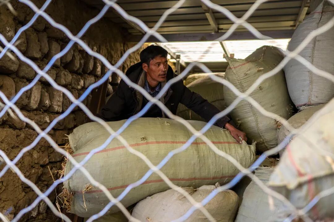 80后村支书顿珠正在村里的牛棚整理饲料。人民网记者 翁奇羽 摄
