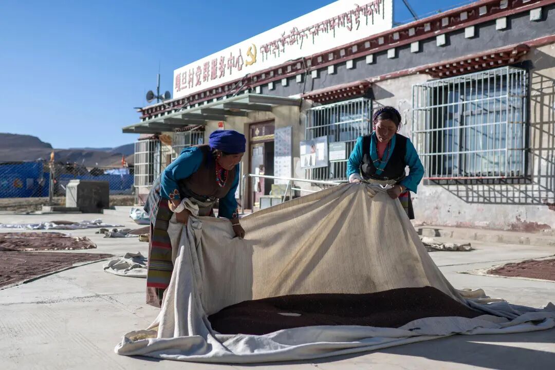 在嘎旦村党群服务中心,村民正在晒菜籽。人民网记者 翁奇羽 摄