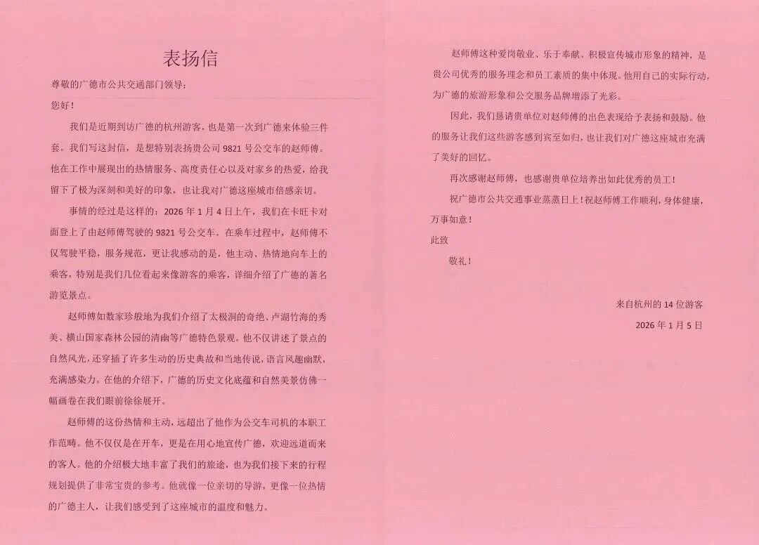 陈女士就是那14位杭州游客之一。1月6日上午,记者联系到她时,她和朋友们还在广德游玩,1月2日到了广德之后,她们一行人已经在当地游玩多日,计划1月6日下午返程。“赵师傅很热情,一路上帮我们介绍广德的风景,我们很感动。”陈女士告诉记者,赵师傅的热情服务让他们在广德感到宾至如归,玩得很开心。“广德人都很热情,我到打印店去打印表扬信,那个小姑娘看我是要表扬广德的公交司机,一直不肯收我们的费。”陈女士笑着说。