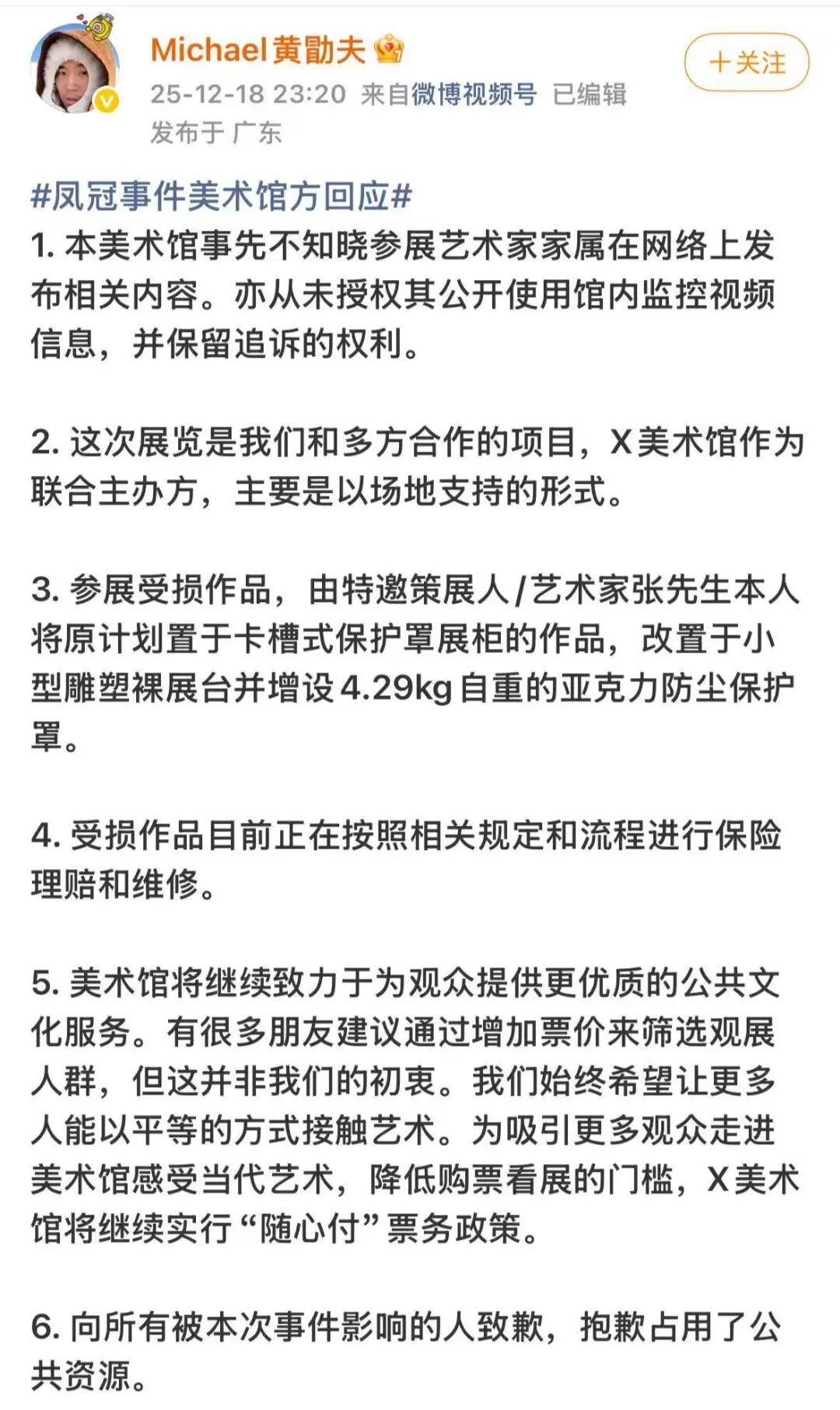 张凯毅回应视频发布后,再次引发网友热议,有网友认为是布展时没有做好防护措施。2025年12月14日,张凯毅的私信及评论已关闭。12月18日,X美术馆创始人“Michael黄勖夫”发文回应“凤冠被毁”事件,称张凯毅丈夫更改了放置凤冠的展台,“参展受损作品,由特邀策展人/艺术家张先生本人将原计划置于卡槽式保护罩展柜的作品,改置于小型雕塑裸展台并增设4.29kg自重的亚克力防尘保护罩。”