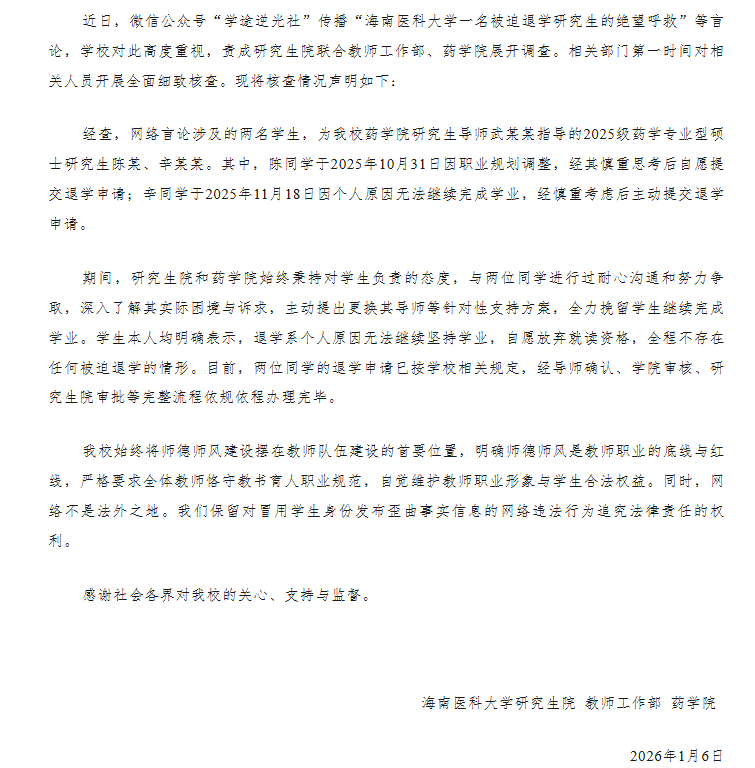 经查,网络言论涉及的两名学生,为我校药学院研究生导师武某某指导的2025级药学专业型硕士研究生陈某、辛某某。其中,陈同学于2025年10月31日因职业规划调整,经其慎重思考后自愿提交退学申请;辛同学于2025年11月18日因个人原因无法继续完成学业,经慎重考虑后主动提交退学申请。