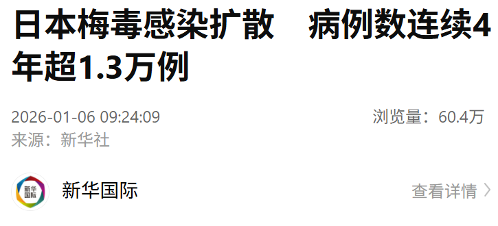 日本媒体5日报道,日本梅毒感染人数近年持续处于高位,确诊病例数连续4年超过1.3万例。