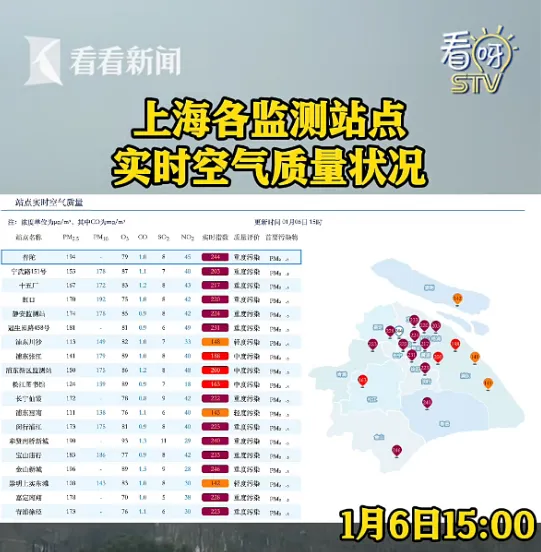 普陀、奉贤南桥新城、宝山庙行、金山新城、青浦徐泾等站点,空气质量重度污染。
