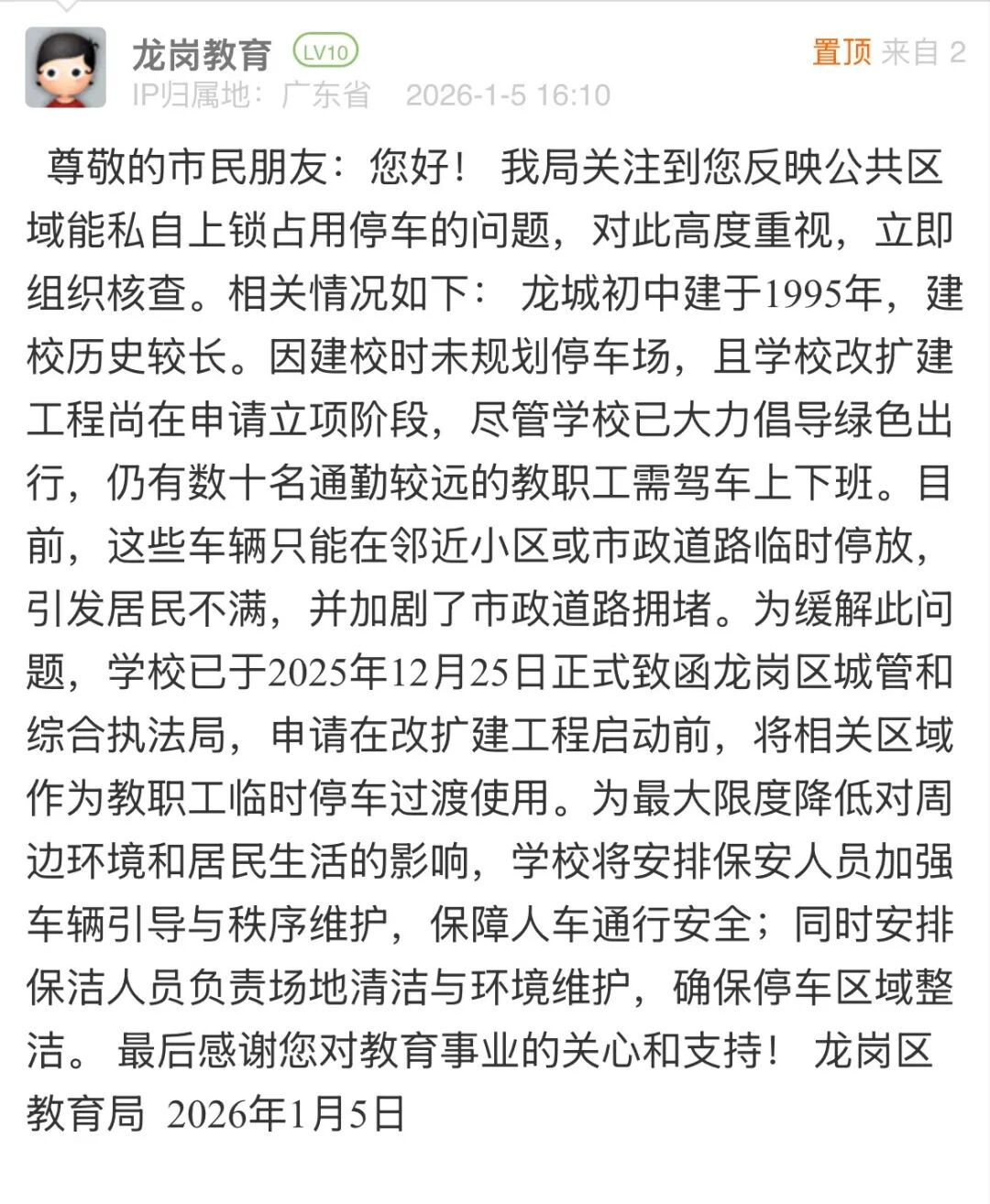 龙城初中建于1995年,建校历史较长。因建校时未规划停车场,且学校改扩建工程尚在申请立项阶段,尽管学校已大力倡导绿色出行,仍有数十名通勤较远的教职工需驾车上下班。目前,这些车辆只能在邻近小区或市政道路临时停放,引发居民不满,并加剧了市政道路拥堵。为缓解此问题,学校已于2025年12月25日正式致函龙岗区城管和综合执法局,申请在改扩建工程启动前,将相关区域作为教职工临时停车过渡使用。为最大限度降低对周边环境和居民生活的影响,学校将安排保安人员加强车辆引导与秩序维护,保障人车通行安全;同时安排保洁人员负责场地清洁与环境维护,确保停车区域整洁。最后感谢您对教育事业的关心和支持!