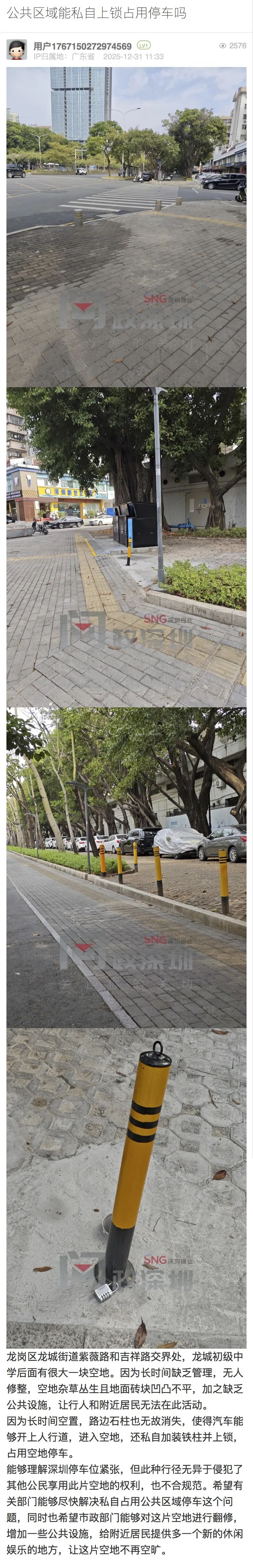 近日,有网友通过《问政深圳》平台反映,龙岗区龙城街道紫薇路和吉祥路交界处,龙城初级中学后面的一块公共区域,有人私自加装铁柱并上锁,占用空地停车。