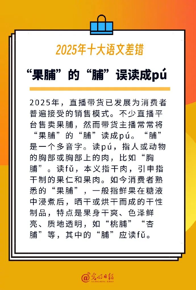 2026年1月6日,《咬文嚼字》编辑部在沪公布2025年十大语文差错,“果脯”的“脯”误读成pú、缅甸首都误为“仰光”等语文生活中出现频率高、覆盖面广的差错入选。
