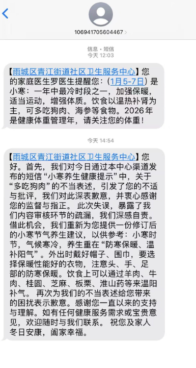 该工作人员表示,短信发送后,就有当地市民向他们反馈此种宣传方式欠妥,随后他们便迅速向市民发送了一条致歉短信,并重新修订一版养生建议。上述工作人员提供的短信截图显示,这条致歉短信提到:“我们对今日通过本中心渠道发布的短信‘小寒养生健康提示’中,关于‘多吃狗肉’的不当表述,引发了您的不适与批评,我们对此深表歉意,并衷心感谢您的监督与指正。此次失误,暴露了我们内容审核环节的疏漏,我们深感自责。”