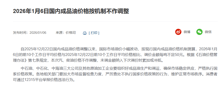 记者获悉,1月6日24时,2026年第一轮成品油调价窗口正式开启。据国家发展改革委价格监测中心监测,本轮成品油调价周期内(2025年12月22日—2026年1月5日),国际油价窄幅波动,按现行国内成品油价格机制测算,调价金额每吨不足50元,本次汽、柴油价格不作调整,未调金额纳入下次调价时累加或冲抵。