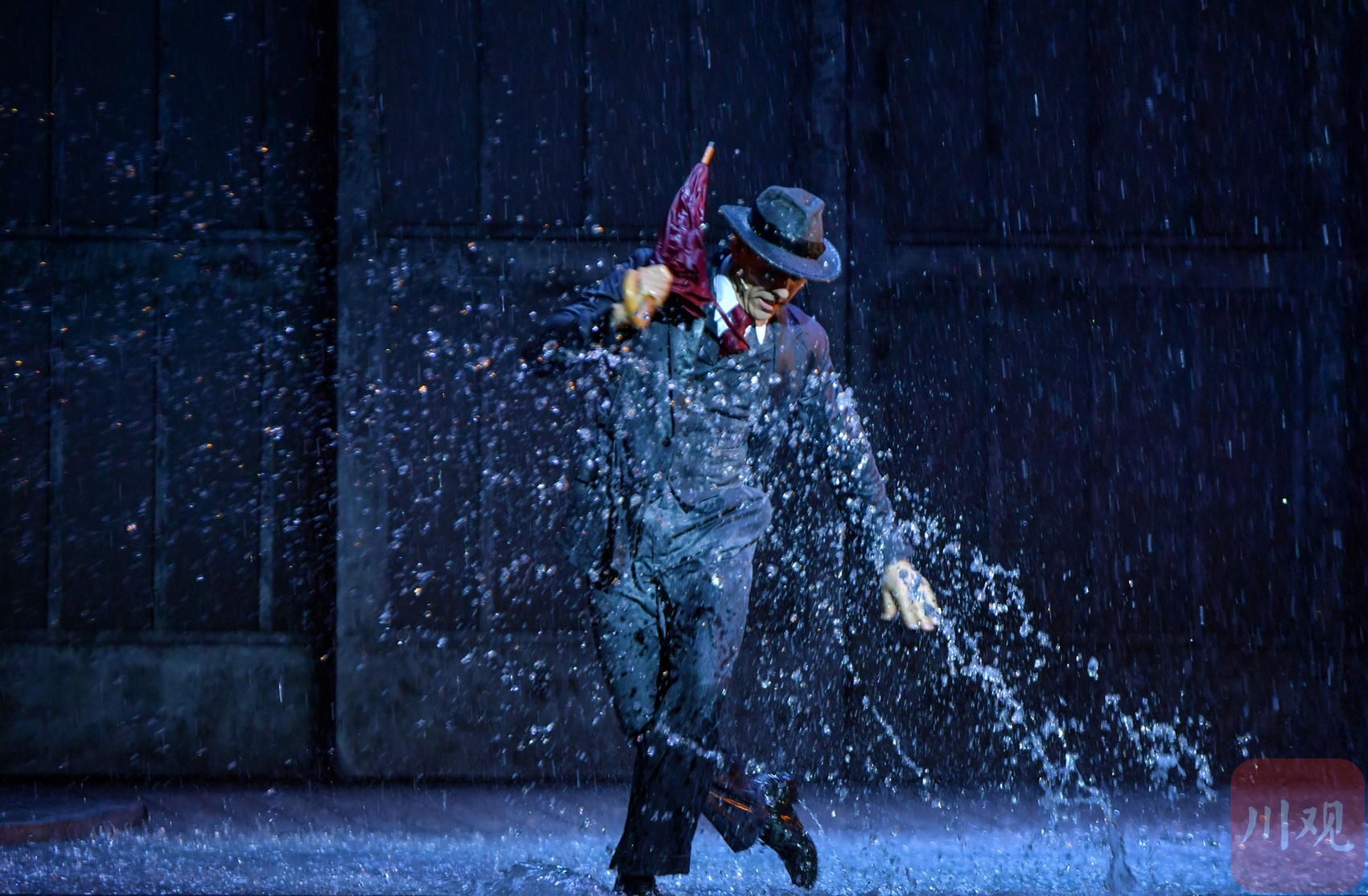 1月6日晚,在成都城市音乐厅内,音乐剧《雨中曲》演员正在“雨中”演出。