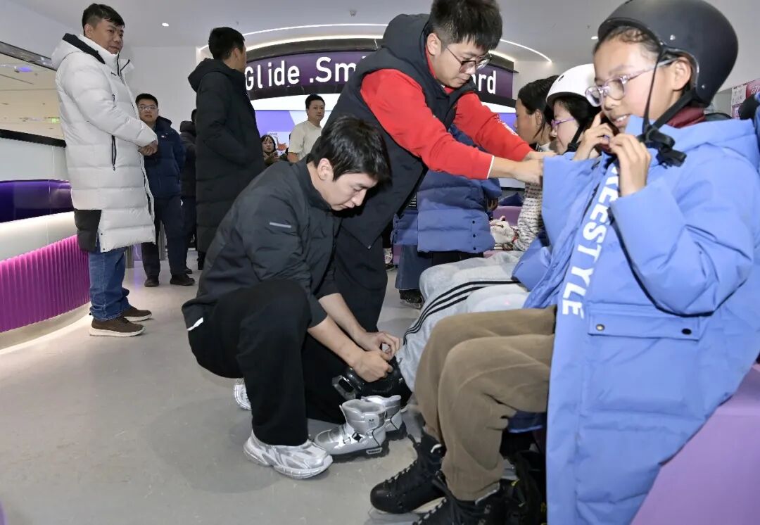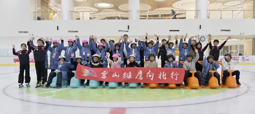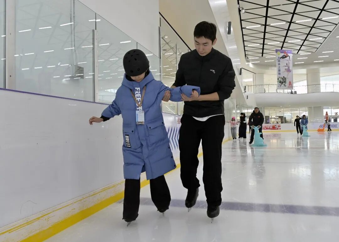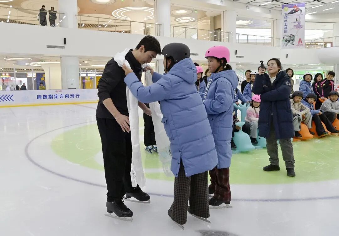 在武大靖团队指导下,小记者们认真穿戴护具、系紧冰鞋。武大靖和教练们也俯身细致检查每个学生的装备安全,一句句轻声鼓励,化解了“雪山雏鹰”初上冰场的紧张。来自各省市训练队及大靖冰上基地的少数民族小队员与小记者们一一结对,帮助他们走进冰场,用同龄人的方式传授滑冰技巧。