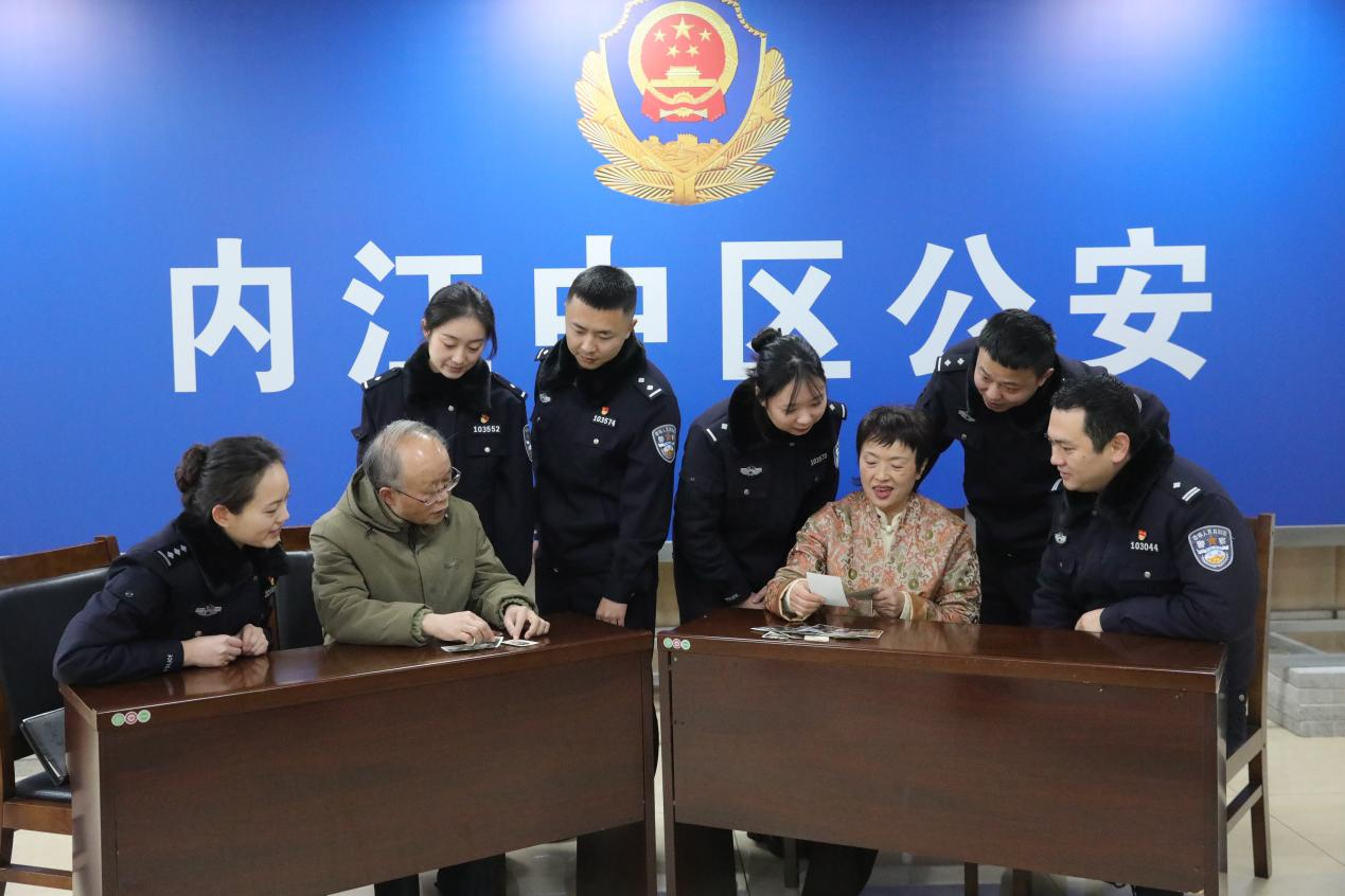 1月4日,内江市公安局市中区分局,两位老民警拿着几张泛黄的老照片给年轻民警讲述过去的故事。对照片里身着72式警服的李华良和杨宗莉来说,岁月的沉淀染白了双鬓,警察的眼神依然坚毅;年轻的容颜虽然随时光逝去,温柔的气质依旧笑靥如花。