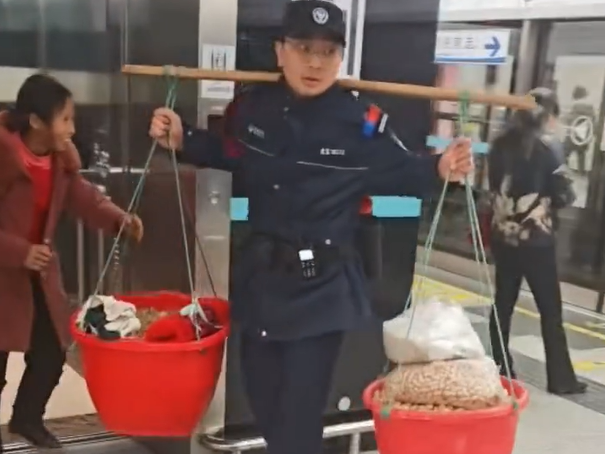 C视频丨成都地铁暖心一幕,保安帮挑扁担送阿姨换乘,网友:眼睛都在用力
