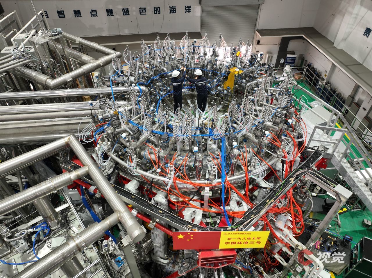 2025年6月7日,科技人员在我国规模最大、参数最高的先进核聚变实验装置——新一代人造太阳“中国环流三号”顶部开展实验前检查工作。