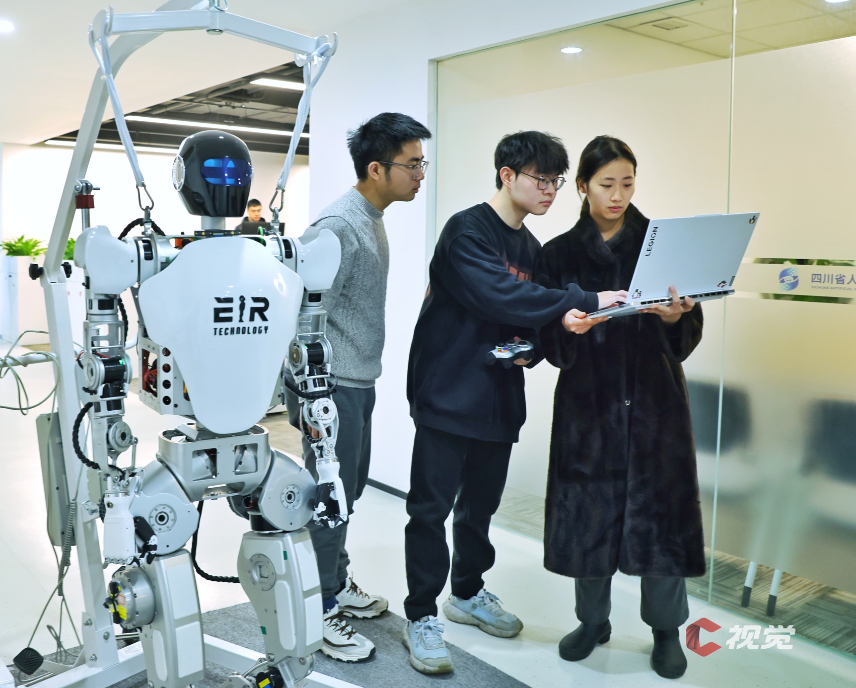 2025年2月27日,四川具身人形机器人科技有限公司的工程师们正在对自主研发的人形机器人—天行者一号进行测试。
