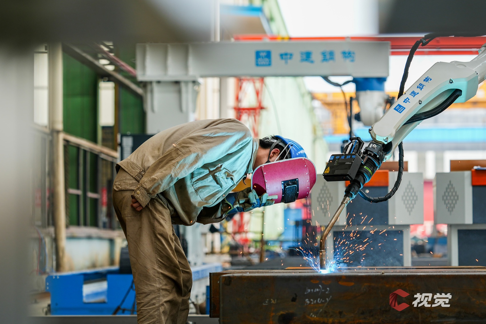 2025年7月8日,天府新区视高街道中建钢构(四川)有限公司加工车间内,工人正配合机器人焊接赶制钢构产品。