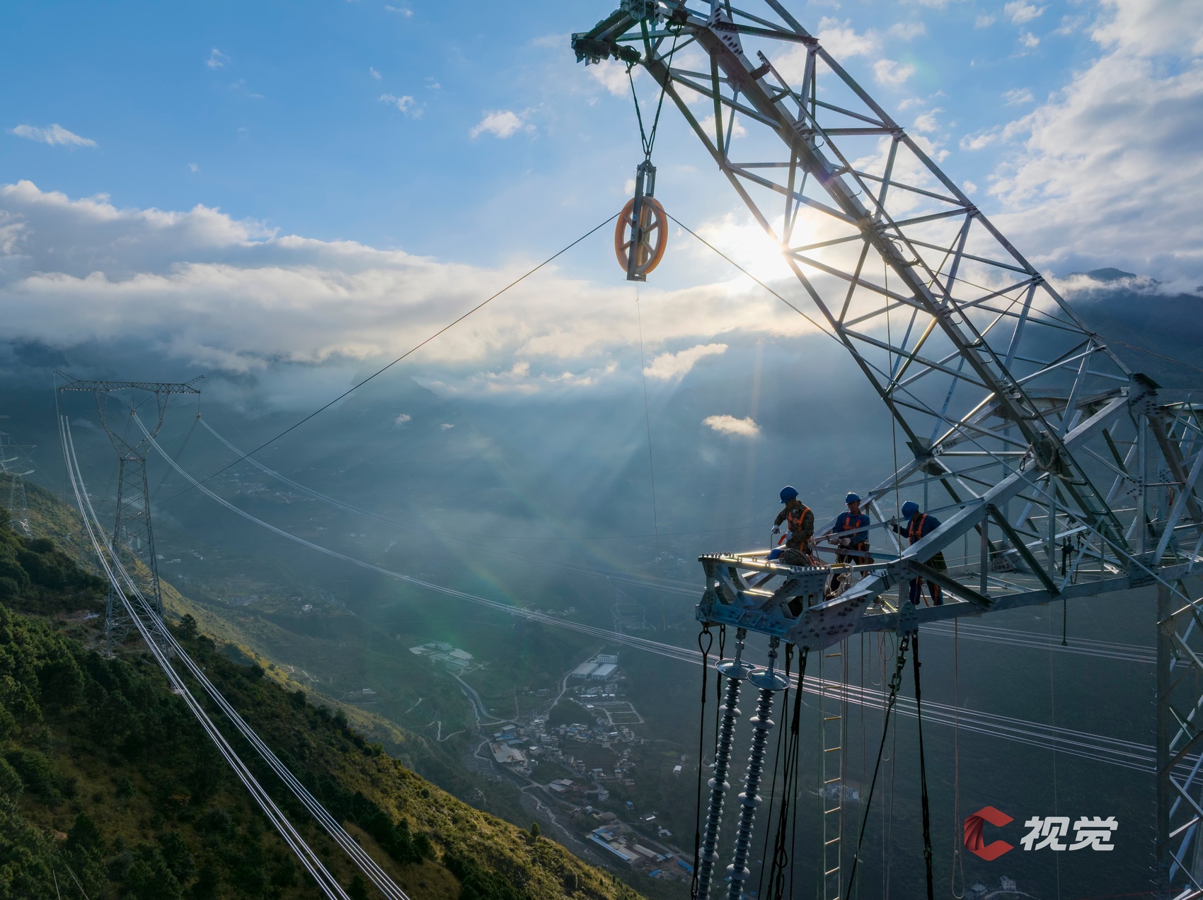 国家电网公司施工人员正在川渝1000千伏特高压交流工程进行收紧导线作业, 川渝特高压工程已进入冲刺阶段。