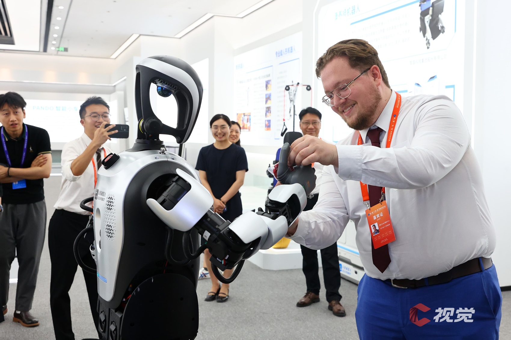 2025年6月12日,四川绵阳机器人智能制造产业园内,来参加第二届“一带一路”科技交流大会的外国嘉宾为服务他的机器人送上他特意准备的一份小礼物。