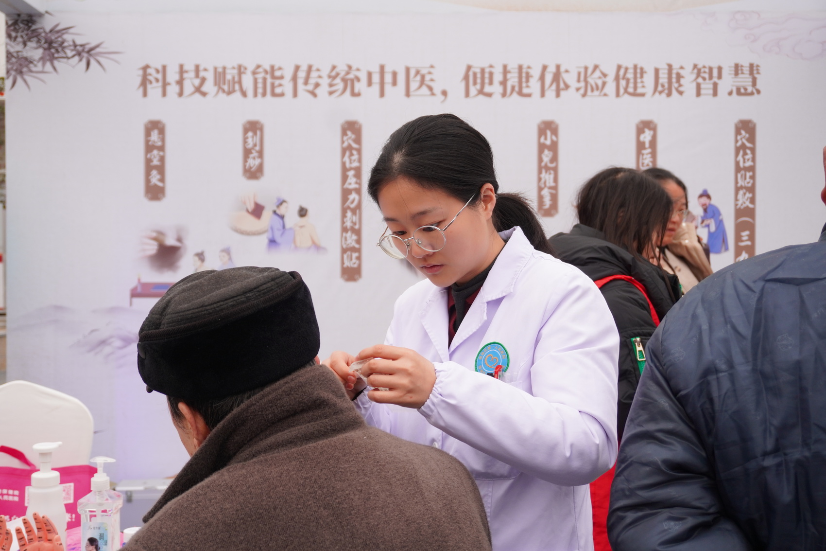 耳穴埋豆、艾灸体验、手工制作中药香囊等互动区域同样人头攒动。居民韦定德体验了刮痧后表示:“原本小腿有些酸胀,调理后轻松多了。”一旁的猜谜区和知识问答区,更是充满了欢声笑语,居民们在趣味互动中学习了不少中医药常识。