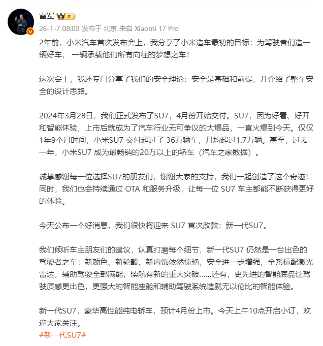 1月7日,小米汽车发文:新一代SU7,预计2026年4月上市。新颜色“卡布里蓝”,惊艳登场。