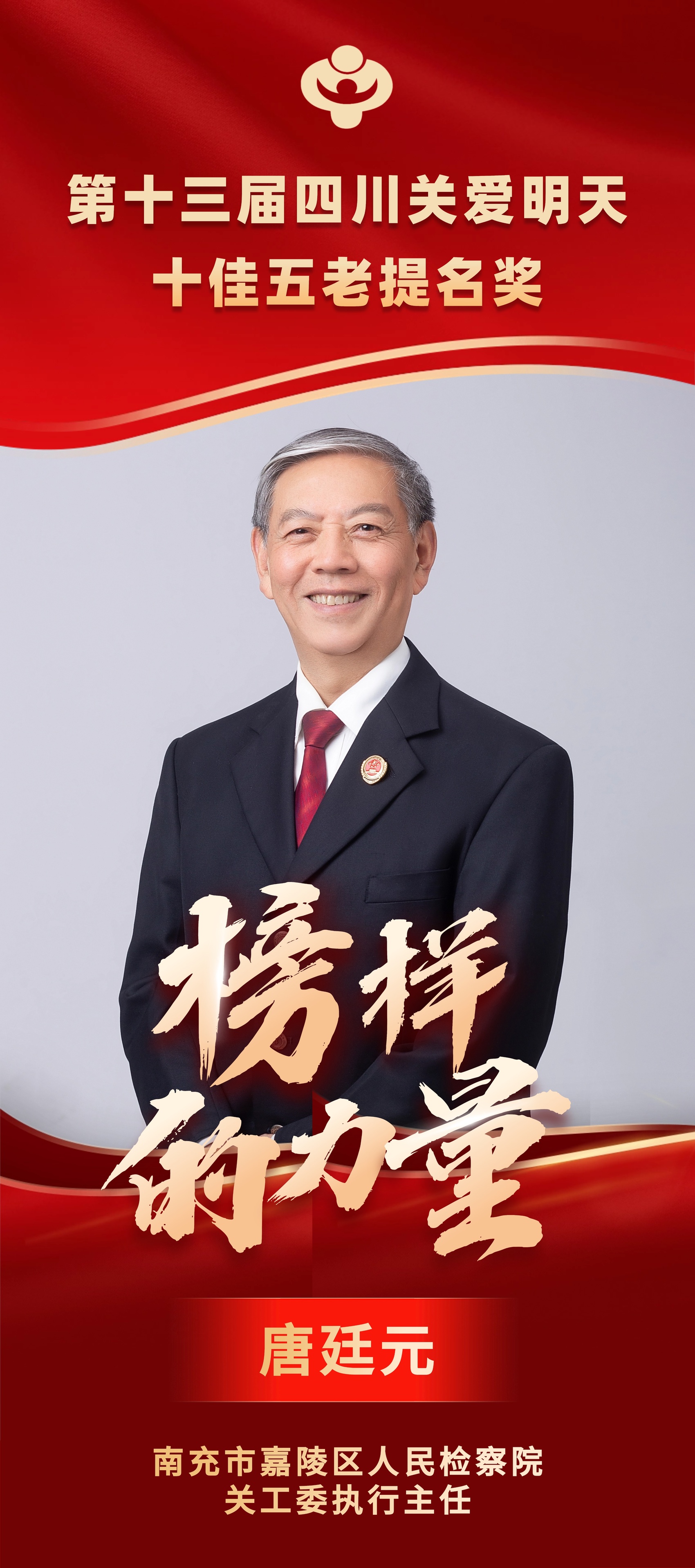 脱下检察蓝,换上关工红。从公诉席到校园台,26年检察信仰延续为15载关工担当。70场宣讲,覆盖3万师生;百余次维权,护航迷途少年。他以自身为盾,为青少年筑牢法治屏障,以七旬高龄之躯深耕红色沃土;以法为灯、以爱为翼,让法治力量与红色基因薪火相传,为青少年点亮人生航标。