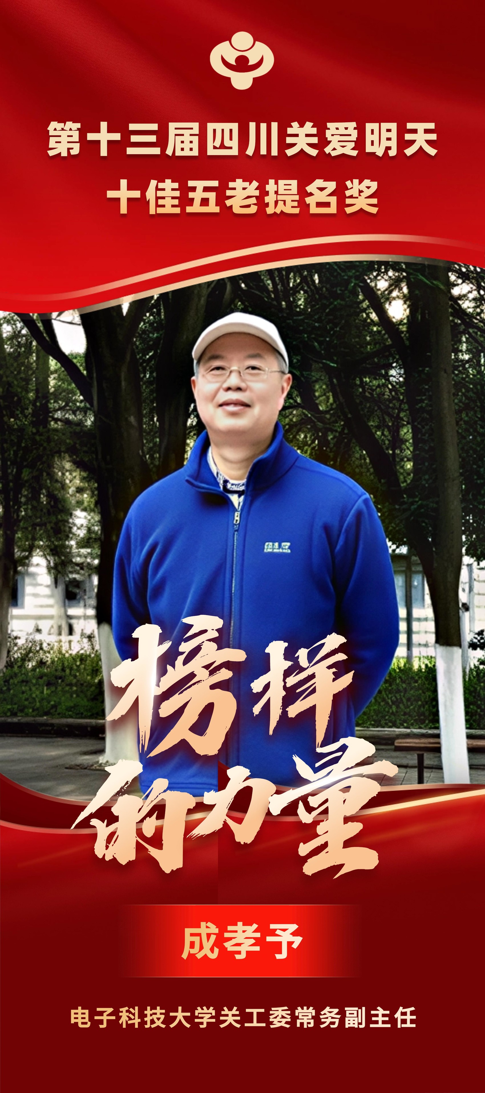 一位老教育工作者,年逾古稀仍躬身育人一线。成孝予教授退休十载,初心不改。他精心谋划,推动成电关工委跻身全国先进;他开拓创新,领衔“成电故事”讲师团,将红色基因植入十万学子心间。从“特聘辅导员”到“引航热线”,他用仁心厚植家国情怀。满园桃李,是他最好的勋章。他以儒雅风范,辉映成电星空。