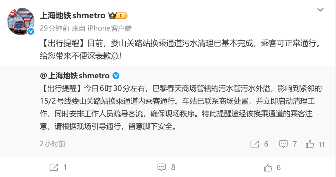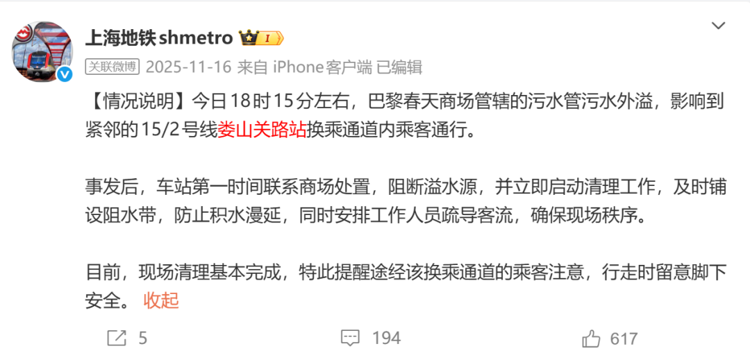 今日6时30分左右,巴黎春天商场管辖的污水管污水外溢,影响到紧邻的15/2号线娄山关路站换乘通道内乘客通行。