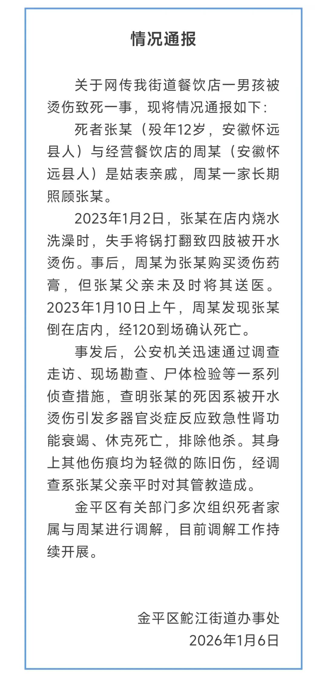 1月6日晚,广东汕头市金平区鮀江街道办事处发布情况通报:事发后,公安机关迅速通过调查走访、现场勘查、尸体检验等一系列侦查措施,查明张某(殁年12岁,安徽怀远县人)的死因系被开水烫伤引发多器官炎症反应致急性肾功能衰竭、休克死亡,排除他杀。