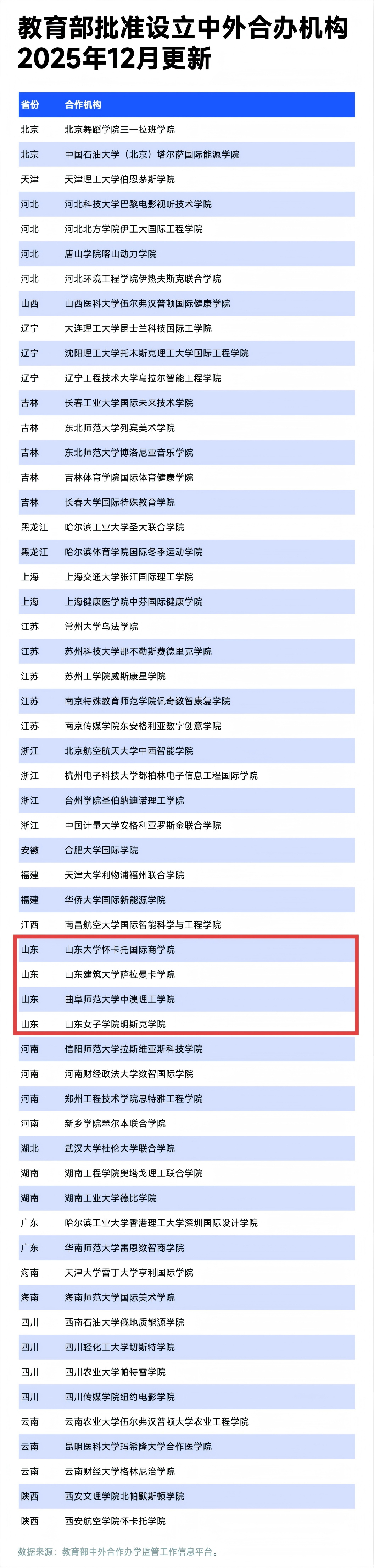 本次新批准设立的中外合办机构中,山东新增4家机构。