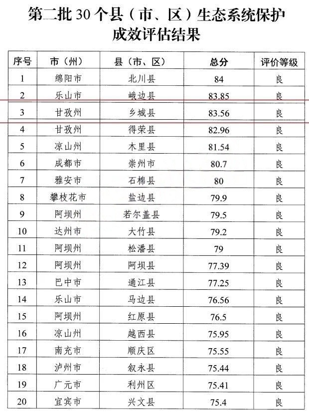 近日,四川省生态环境厅印发《第二批30个县(市、区)生态系统保护成效评估结果的通知》。乡城县在全省21个市(州)参评的30个县(市、区)中脱颖而出,以过硬实绩荣获全省第三名。