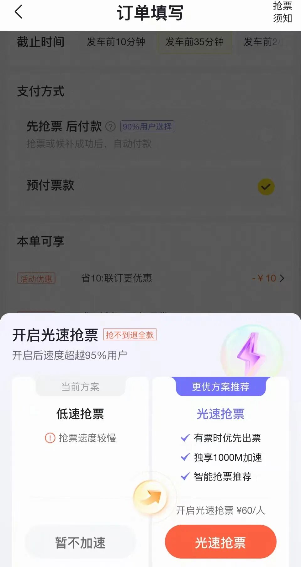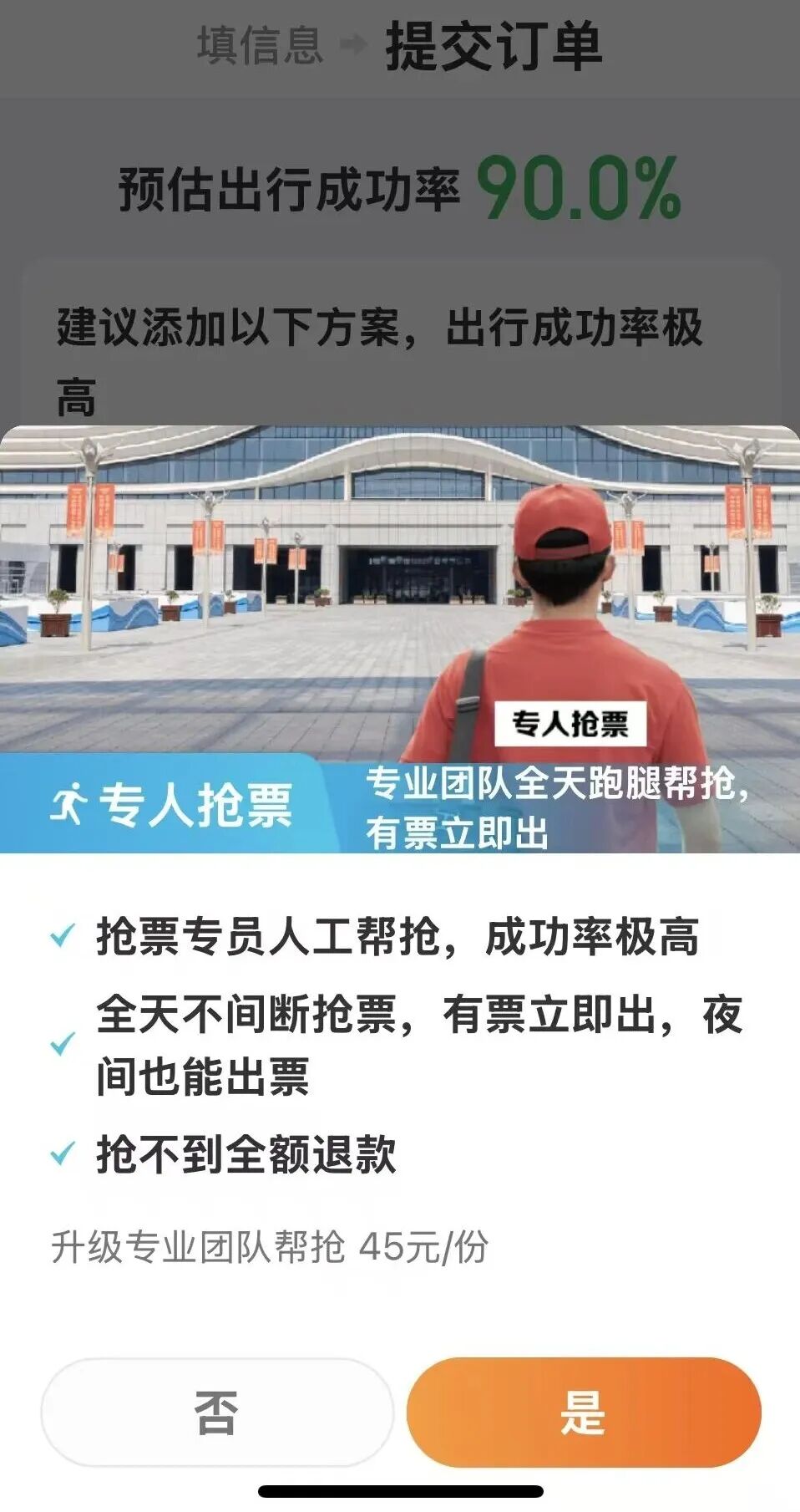 还有些平台,显示的抢票成功率都高达90%了,还用各种方式使劲推荐用户“加价抢票”。虽然加得不多,也就5元、10元、18元,最高48元,但难免让人怀疑,这笔钱到底是为了成功抢票,还是为了成功收费。