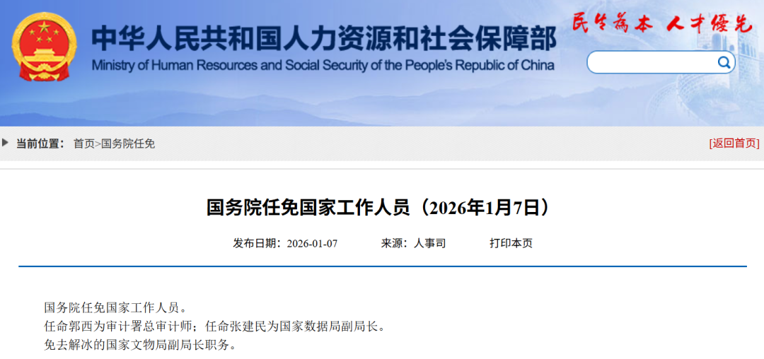 任命郭西为审计署总审计师;任命张建民为国家数据局副局长。