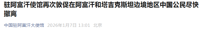 1月7日,驻阿富汗使馆敦促在阿富汗和塔吉克斯坦边境地区中国公民尽快撤离。
