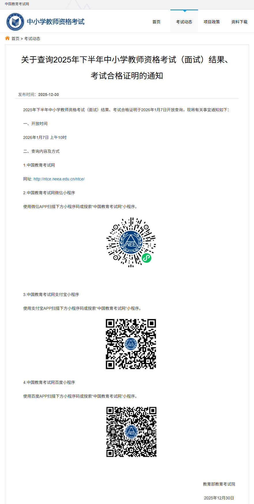 中小学教师资格考试(面试)结果