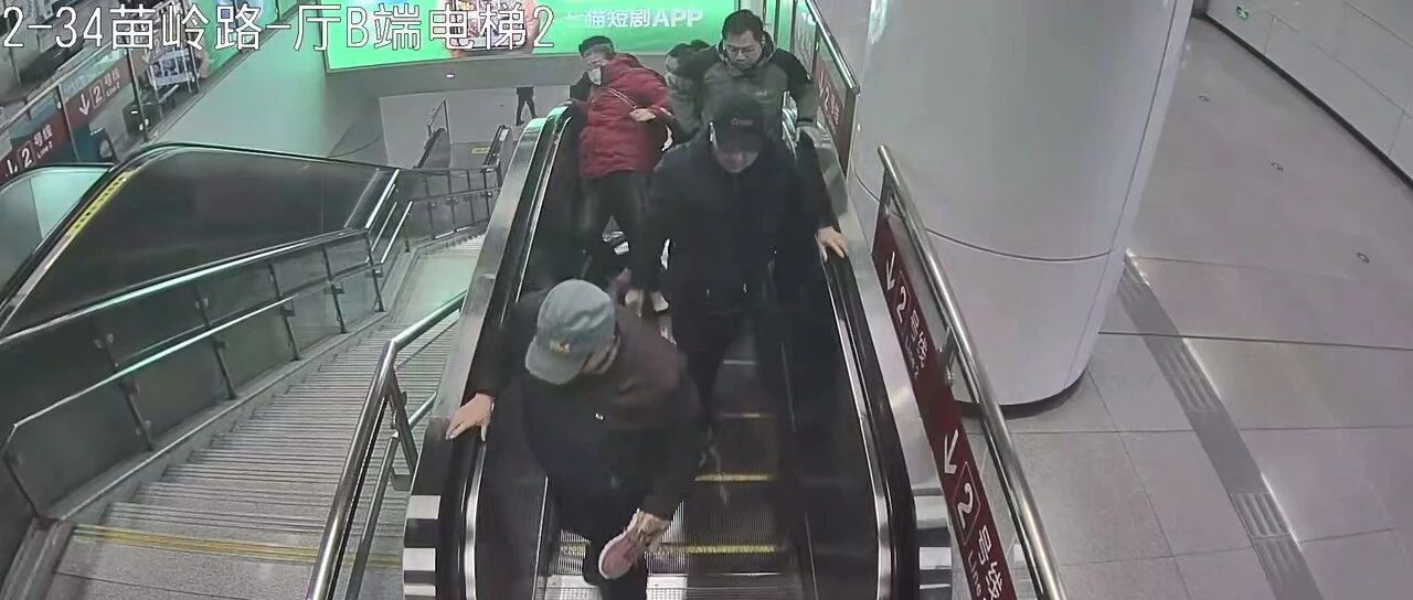 从监控画面可见,该乘客从站厅层乘手扶梯下行至站台层时,其外套一侧已冒出明火。站台候车乘客察觉后,迅速向一侧躲避。