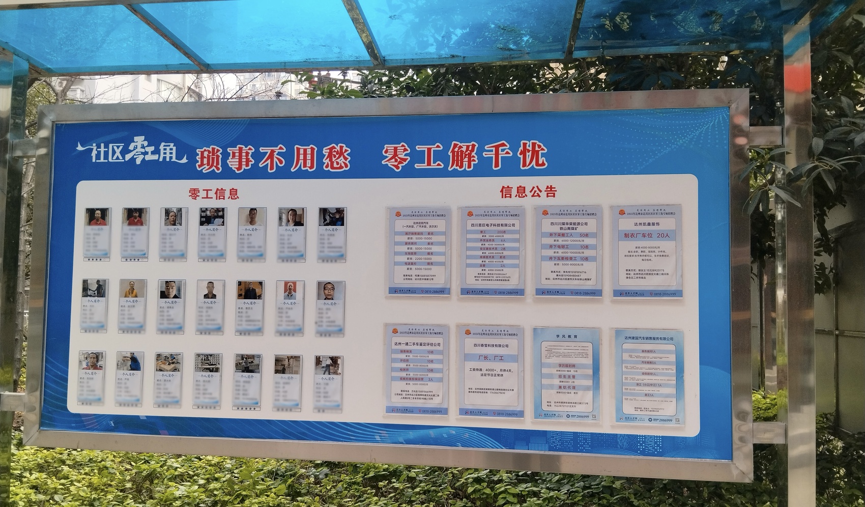 “我们社区零工角公示栏上设有8个企业招聘信息展示位及21个零工信息展示位。”1月7日,达州市达川区杨柳街道文兴社区党委书记李永洪更新着公示栏上的招聘信息,上面“琐事不用愁 零工解千忧”10个字分外惹眼,“这样的信息公告方式反响还不错,让大家足不出社区就能获得职业信息,需要开锁、维修等便民服务的也能方便快捷地满足需求。”
