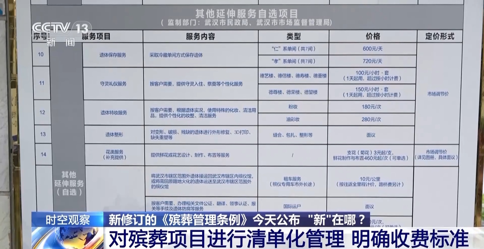 武昌殡仪馆副馆长 陈骏驹:我们清理了一批群众选择率低的服务项目,服务项目总数已经降至15项。严格执行武汉市基本殡葬服务普惠制政策,主要是四免一送,主动下调了骨灰盒、寿衣等丧葬用品的定价。