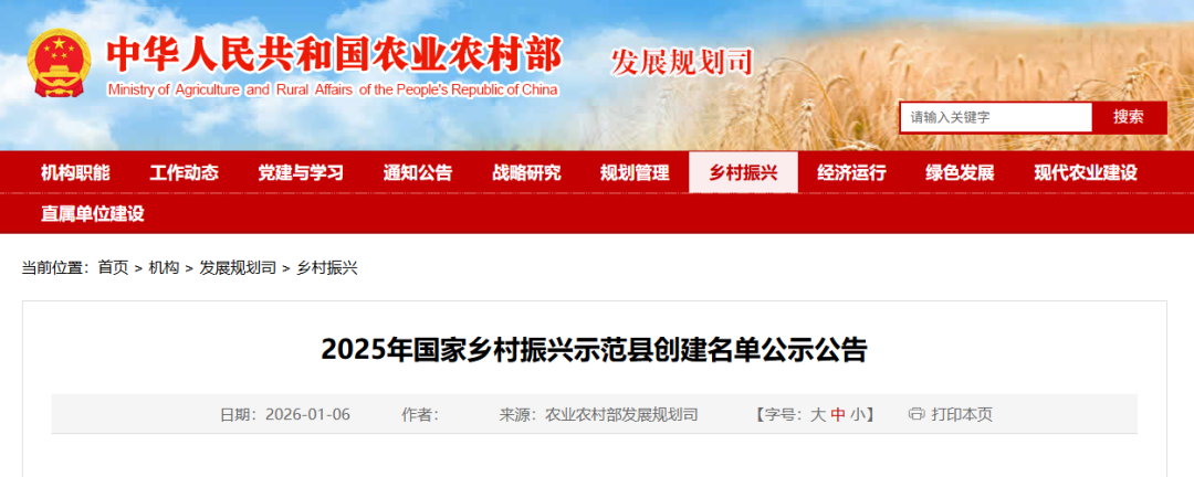 贯彻落实党中央、国务院关于推进乡村全面振兴的决策部署,按照中央关于创建示范活动管理的有关要求,农业农村部开展2025年国家乡村振兴示范县创建工作。近期,经地方推荐、专家评审,形成拟纳入2025年国家乡村振兴示范县创建名单(附件),现将北京市顺义区等83个申报单位名单予以公示。公示期为1月6—8日。如有异议,请实名向农业农村部发展规划司反映。反映情况要实事求是,并将证明材料发至xczxc@agri.gov.cn。