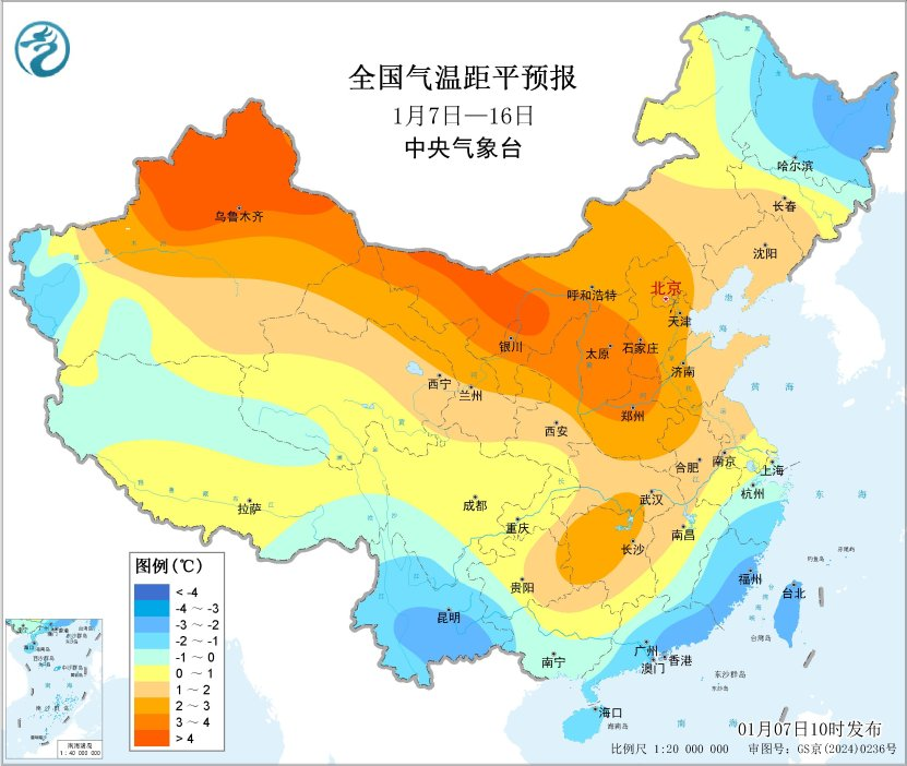 中央气象台中期预报显示,未来10天,西北地区、华北、黄淮、江南西部等地平均气温较常年同期偏高1~2℃,其中新疆北部、内蒙古西部等地偏高3~5℃;东北地区北部、江南东部、华南东部及云南等地气温偏低1~2℃;我国其余大部分地区气温接近常年。