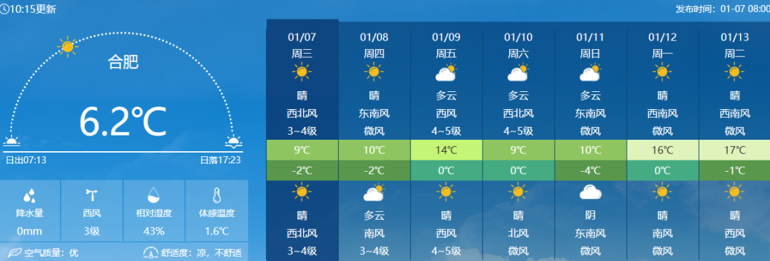 像六安,9日最高气温16℃,最低气温仅1℃,昼夜温差可达15℃;合肥,13日昼夜温差更是高达18℃,早晚时段出行需加强保暖措施。