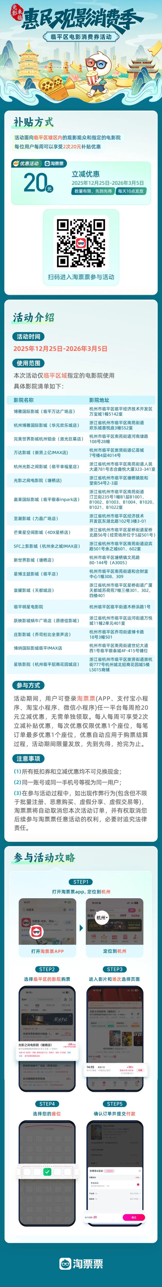 日前,“光影来临”惠民观影消费季,临平区电影消费券活动启动,活动时间为2025年12月25日至2026年3月5日,每天10点限量发放消费券!每周每人可享2次20元立减优惠,观影最高可省40元,全区共18家影院均可使用!