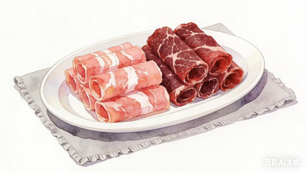 “颜值”方面,不管是牛肉卷还是羊肉卷,它们的脂肪都像雪花一样被均匀包裹在肌肉纤维间,属于 “肌脂混合型选手”。冷冻后,这种结构依然稳定,切薄片时脂肪与瘦肉紧密粘连、不易散,甚至薄如蝉翼还能卷成花。