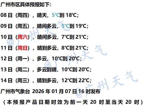 具体到广州天气,8日、9日最低气温只有5℃,最高是18-19℃。从7日17时许起,广州市多区寒冷预警已升级为橙色。