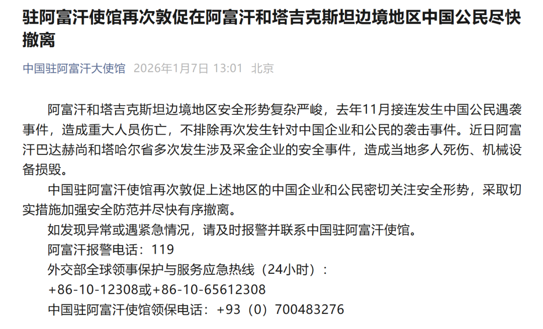 中国驻阿富汗使馆再次敦促上述地区的中国企业和公民密切关注安全形势,采取切实措施加强安全防范并尽快有序撤离。