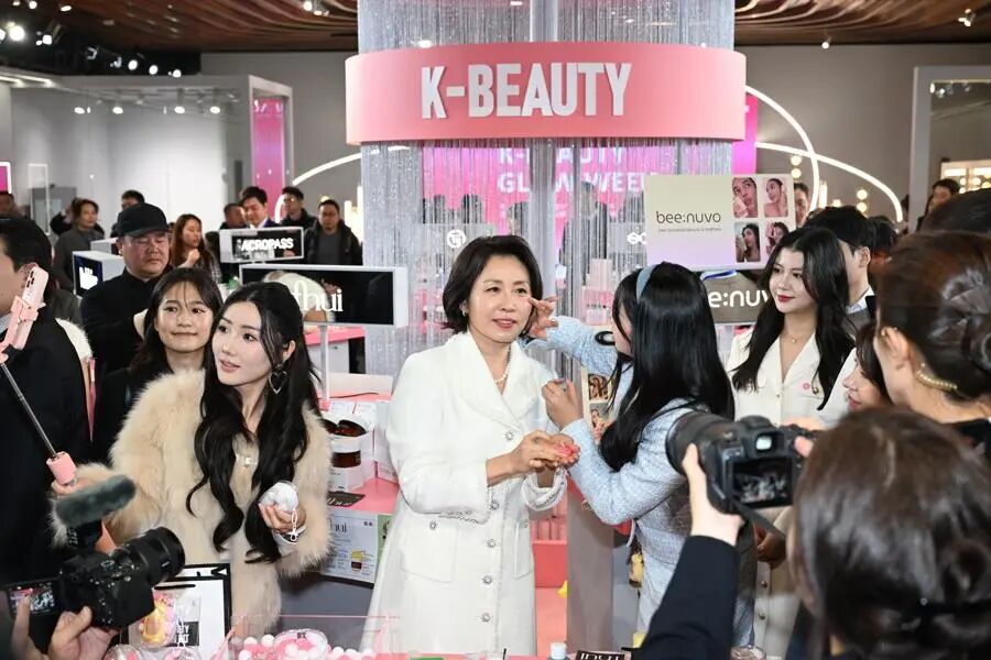 据解放日报报道,7日上午,韩国总统夫人金惠景来到上海BFC复星艺术中心,参观“K-BEAUTY GLOW WEEK”活动,感受韩国美妆品牌产品。在现场,金惠景为这些摩拳擦掌的韩妆企业加油打气。