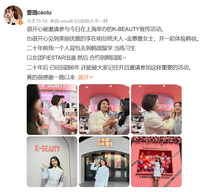 极目新闻记者查询发现,与金惠景一起使用腮红的是韩国女团Fiestar的中国籍成员曹璐。下午3时50分,曹璐在个人社交平台上发布了与金惠景一起的活动照片。