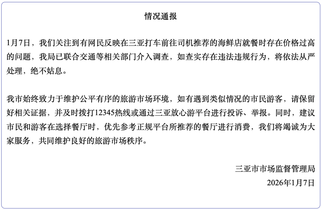 1月7日,关注到有网民反映在三亚打车前往司机推荐的海鲜店就餐时存在价格过高的问题,三亚市市场监督管理局已联合交通等相关部门介入调查,如查实存在违法违规行为,将依法从严处理,绝不姑息。