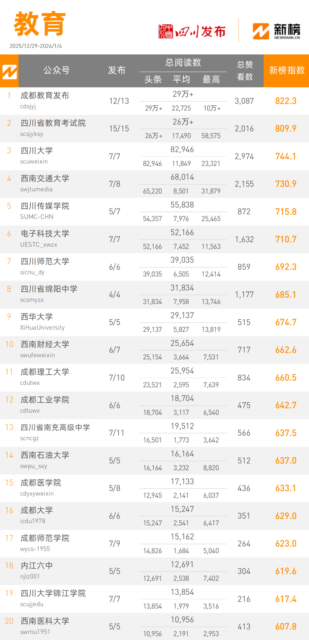 “成都教育发布”本周以290000+次阅读量总数,822.3新榜指数领跑教育类榜单,“四川教育考试院”本周以260000+次阅读量总数,809.9新榜指数获得教育类榜单第二名。