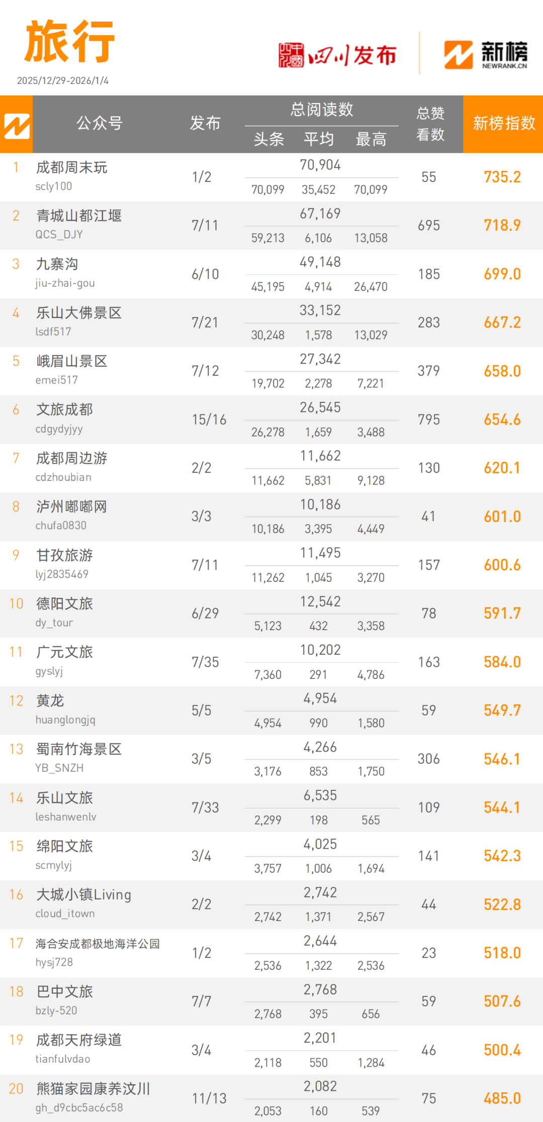 “成都周末玩”本周以70904阅读量总数,735.2的新榜指数摘得旅行类榜单桂冠,“青城山都江堰”本周以67169阅读量总数,718.9的新榜指数将旅行类榜单榜眼收入囊中。