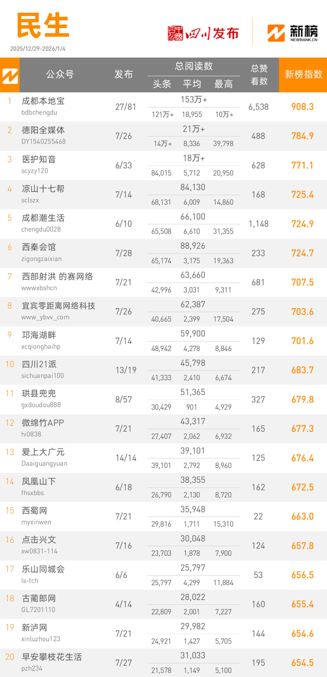 “成都本地宝”本周以1530000+次阅读量总数摘得民生类榜单桂冠,“德阳全媒体”本周以210000+次阅读量总数,784.9的新榜指数占据民生类榜单第二名。