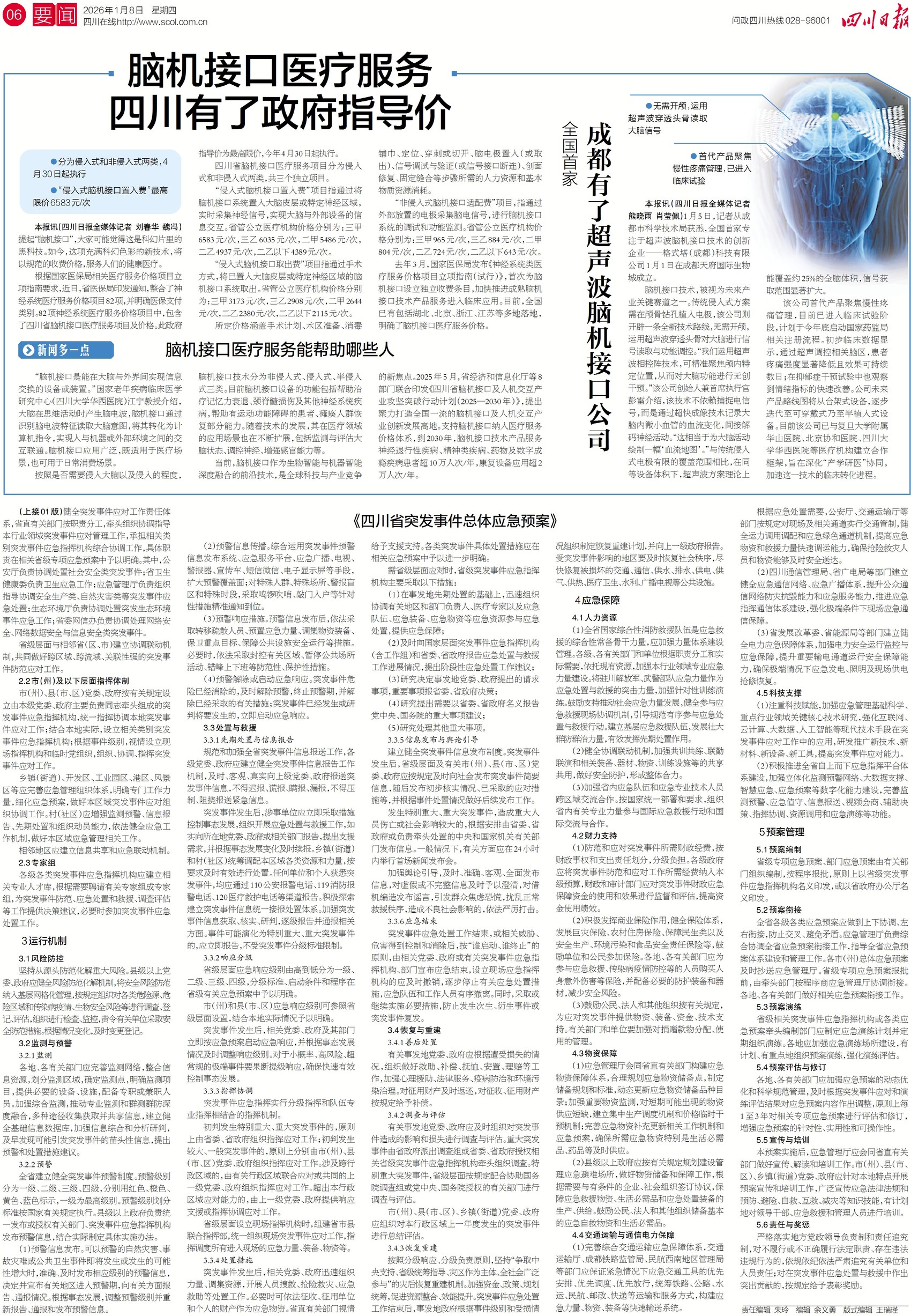 科幻片里的黑科技脑机接口,离咱不远啦!今年元旦,全国首家专注于超声波脑机接口技术的创新企业——格式塔(成都)科技有限公司在成都成立,首代产品聚焦慢性疼痛管理,已经进入临床试验。不仅如此,最近省医保局还印发通知,为脑机接口医疗服务提供政府指导价,“侵入式脑机接口置入费”最高限价每次6583元。想了解四川还提供了哪些利好?请关注今天六版。